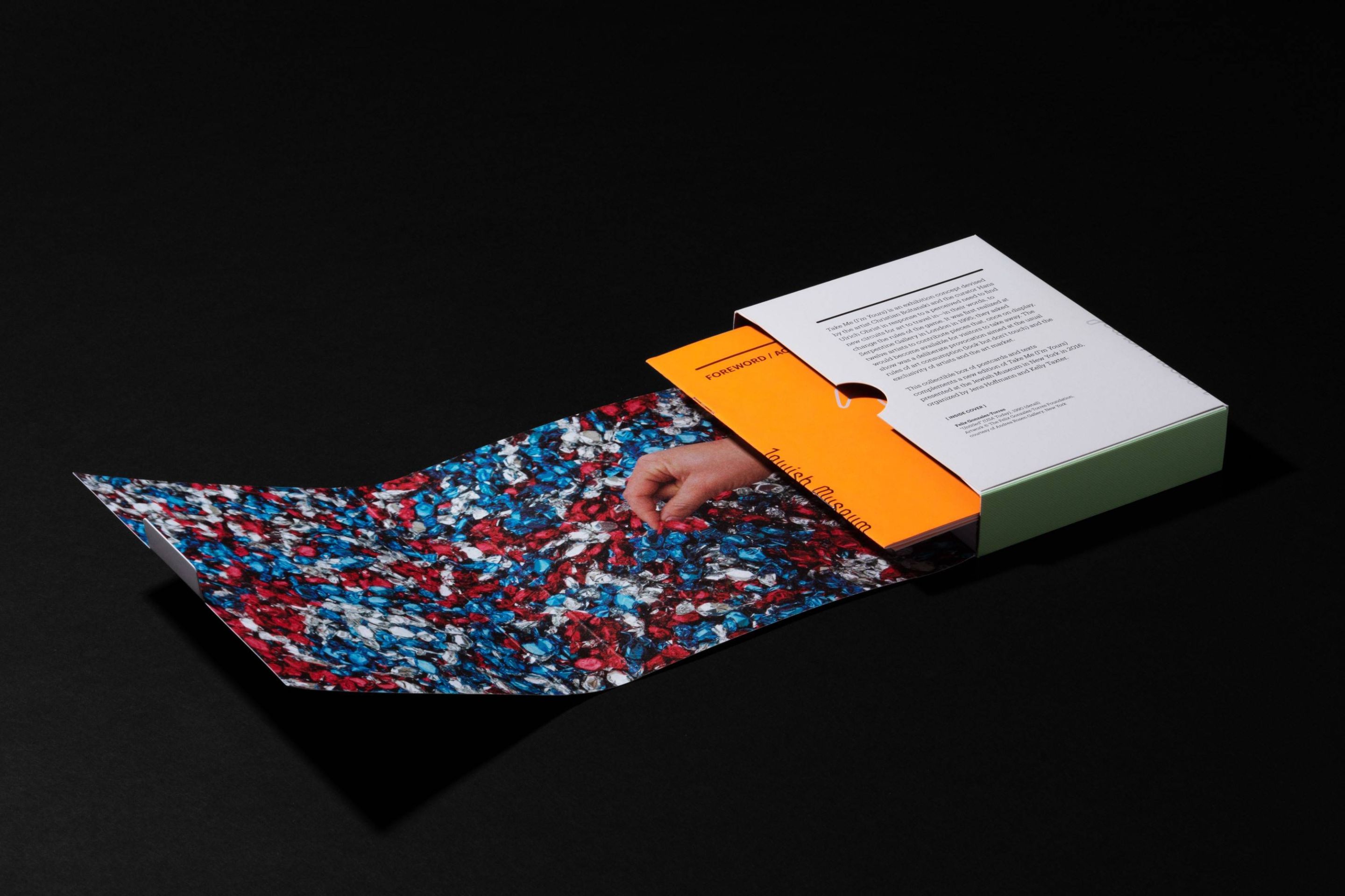 We created this exhibition catalog design; the box contained over 40 postcards and three separate but connected saddle-stitched booklets.