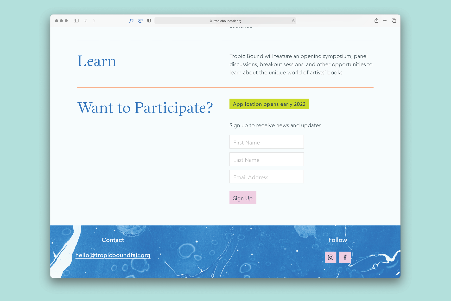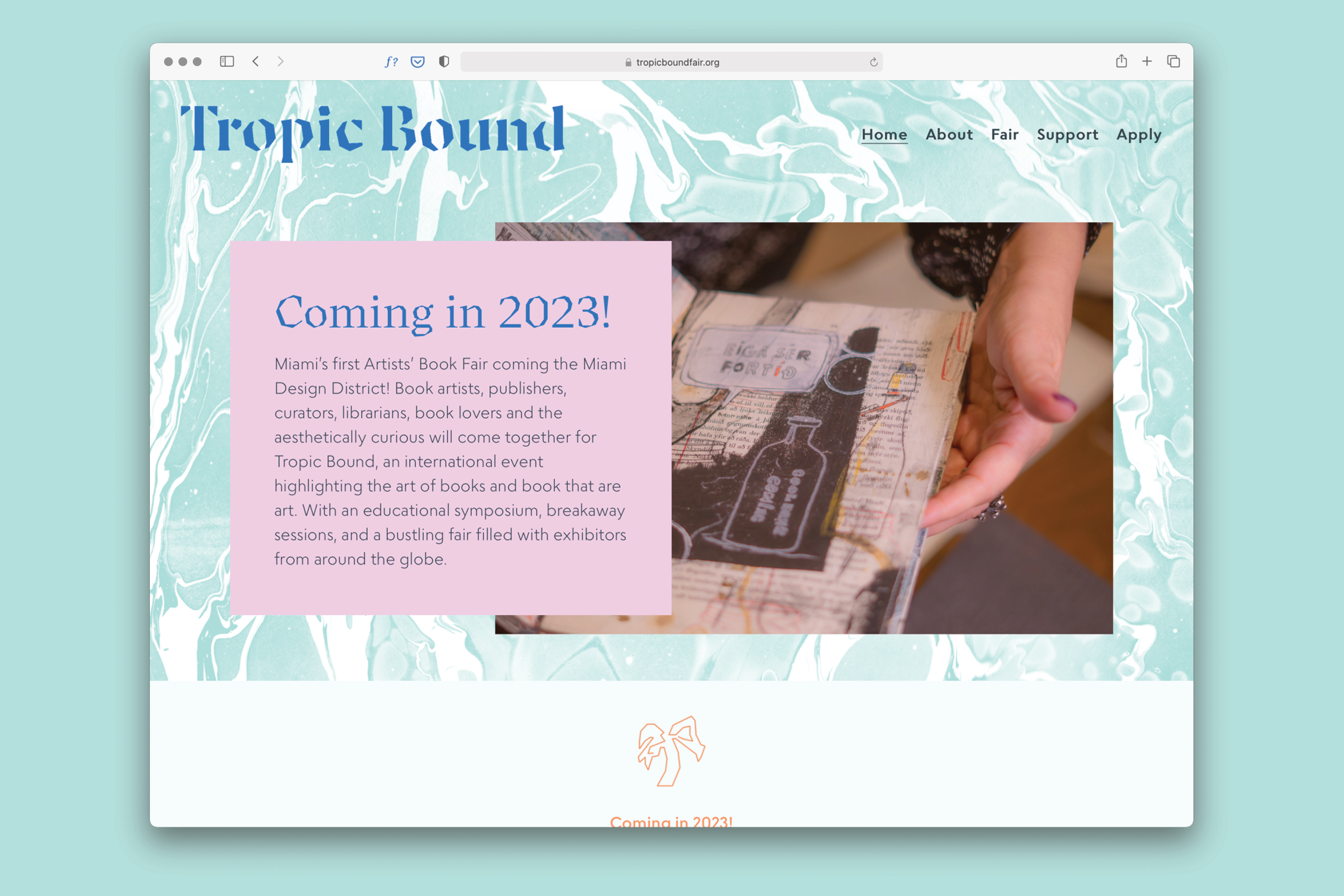 Tropic Bound’s identity represents the book arts. Their priorities are not just to showcase this artistic outcome, though. Rather, they want to illuminate it as an interactive, intimate, and provocative art experience. The brand is all about craft and materiality; its foundation is inspired by different techniques related to book arts: woodcuts, marbling, and watermarks.